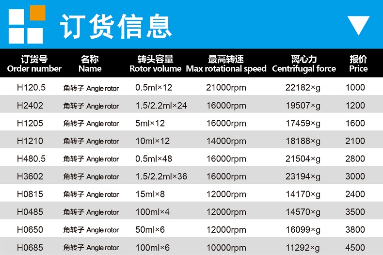 訂貨號(hào) | 角轉(zhuǎn)子 | 轉(zhuǎn)頭容量 | 最高轉(zhuǎn)速 | 離心力 |