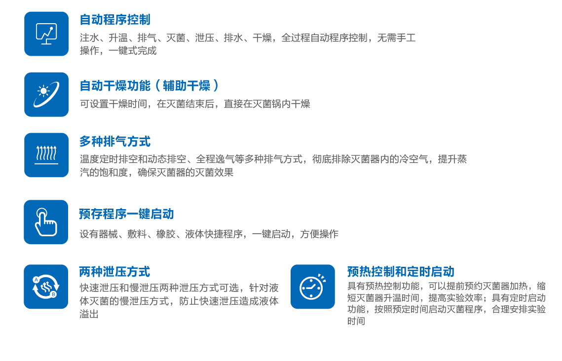 產(chǎn)品以高溫飽和水蒸氣為滅菌介質(zhì)的立式全自動(dòng)快速滅菌設(shè)備。適用于化驗(yàn)室、實(shí)驗(yàn)室、手術(shù)室、供應(yīng)室、高等教育、畜牧業(yè)、疾控等各級(jí)醫(yī)療衛(wèi)生和生物醫(yī)學(xué)科研單位,對(duì)器械、敷料、橡膠、液體、玻璃器皿、培養(yǎng)基、廢棄物等物品的快速滅菌。