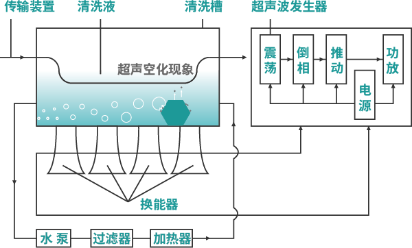 通過(guò)換能器,將功率超聲頻源的聲能轉(zhuǎn)換成機(jī)械振動(dòng),通過(guò)清洗槽壁將超聲波輻射到槽子中的清洗液。由于受到超聲波的輻射,槽內(nèi)液體中的微氣泡能夠在聲波的作用下快速變大破裂,破裂時(shí)產(chǎn)生的高強(qiáng)度剪切力作用于各類樣品上,從而達(dá)到清洗、提取、乳化、加速溶解、粉碎、分散等作用。