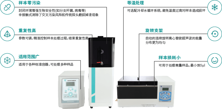 非接觸式超聲波粉碎機(jī)也叫杯式超聲破碎儀,可在密閉容器、無(wú)菌、可超微量條件下進(jìn)行破碎。相比傳統(tǒng)的探頭超聲波細(xì)胞粉碎機(jī),該儀器具有一次可同時(shí)檢測(cè)多個(gè)樣品、實(shí)驗(yàn)效率高、無(wú)需頻繁操作探頭、避免樣本交叉污染等優(yōu)勢(shì)。且該儀器可選配低溫恒溫裝置,便于樣品在4-10℃環(huán)境內(nèi)工作,使能量分布均勻,超聲作用完全。逐漸成為ChIP(染色質(zhì)免疫共沉淀)和DNA剪切研究平臺(tái)不可缺少的標(biāo)準(zhǔn)化工具。