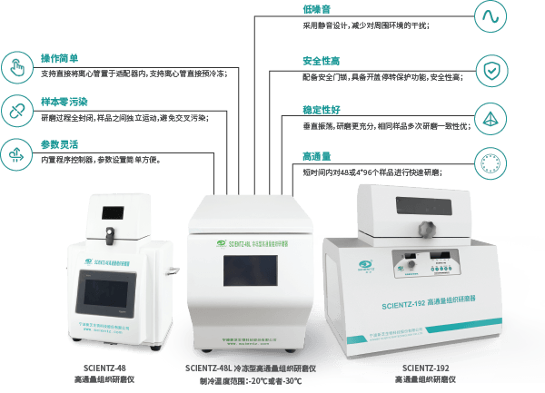 SCIENTZ-192高通量組織研磨器也同樣采用高頻垂直振蕩的方式,用戶可以選擇不同的研磨珠對不同性狀的樣品在離心管內(nèi)直接對樣品進行研磨,研磨管內(nèi)樣品與研磨球相互碰撞,其產(chǎn)生的研磨剪切力和撞擊力使組織完全破碎,從而有效分離提取原始DNA、RNA。