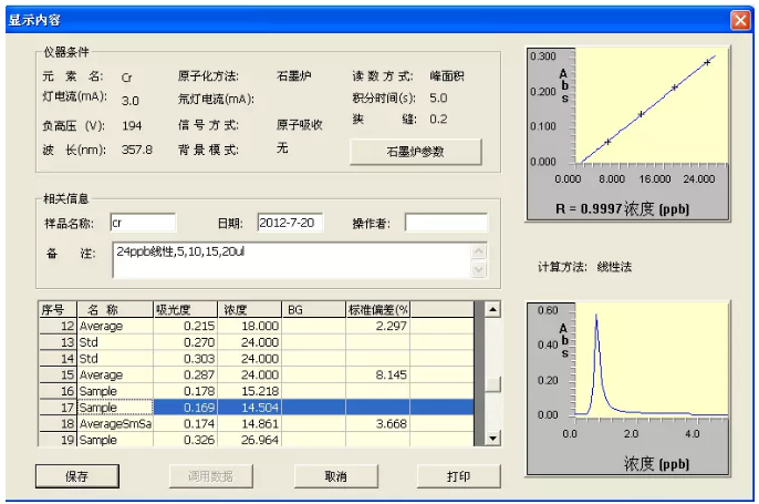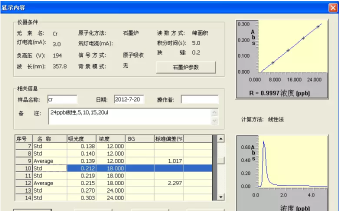 2、試樣測定:分別吸取試樣液和試劑空白各20 μl,注入石墨爐,測得其吸光度代入標(biāo)準(zhǔn)線性回歸方程中求得試樣中鉻含量。