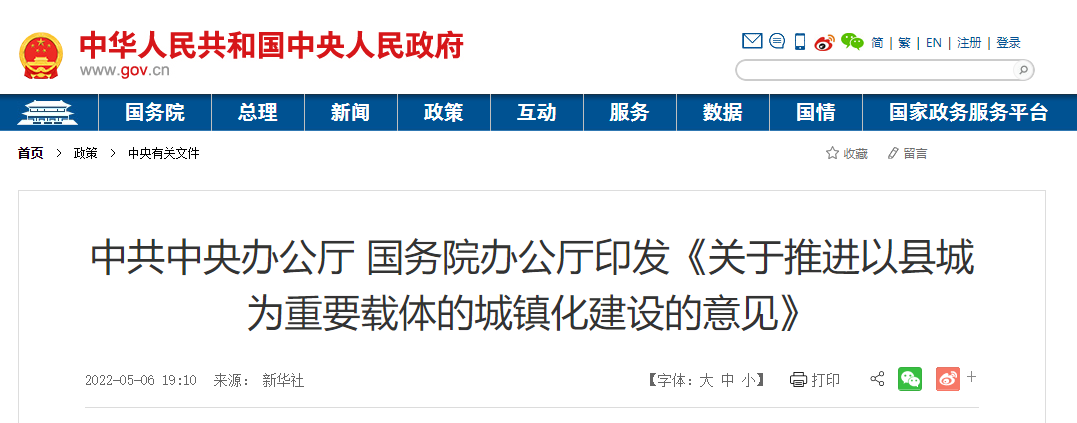 5月6日,中共中央辦公廳、國務(wù)院辦公廳印發(fā)了《關(guān)于推進(jìn)以縣城為重要載體的城鎮(zhèn)化建設(shè)的意見》,并發(fā)出通知,要求各地區(qū)各部門結(jié)合實(shí)際認(rèn)真貫徹落實(shí)。