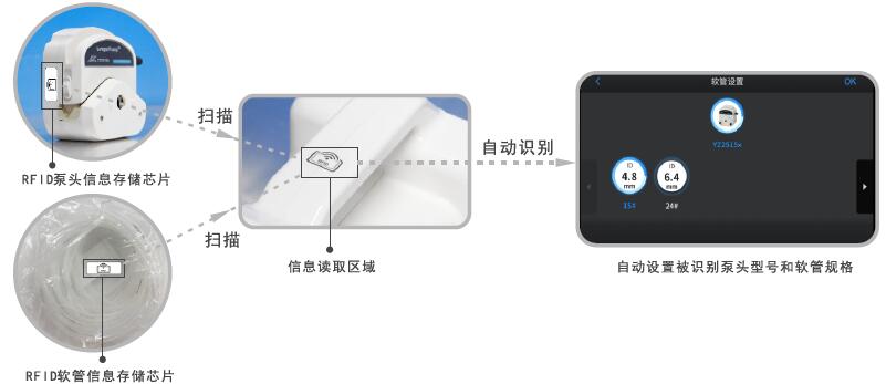 新推出的三款智能蠕動(dòng)泵具有“泵頭和軟管型號(hào)自動(dòng)識(shí)別”功能。通過(guò)RFID技術(shù),泵可自動(dòng)讀取泵頭型號(hào)和軟管規(guī)格信息,并在運(yùn)行方案中設(shè)置相應(yīng)參數(shù)。不僅幫助客戶簡(jiǎn)化操作過(guò)程,提高工作效率,而且能夠有效保證泵頭與軟管參數(shù)的正確性,為實(shí)現(xiàn)高精度的流體傳輸提供有力支持。