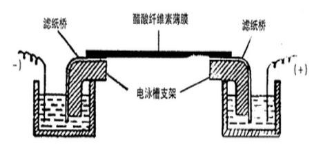 以醋酸纖維制成的薄膜作為支撐體的電泳稱(chēng)為薄膜電泳。 醋酸纖維是纖維素的醋酸酯,由纖維素的羥基經(jīng)乙酰化而成。 將之溶于丙酮等有機(jī)溶劑中,即可涂布成均一細(xì)密的微孔薄膜, 厚度約以0.1-0.15mm為宜。 醋酸纖維素薄膜與濾紙相比較,有以下優(yōu)點(diǎn):